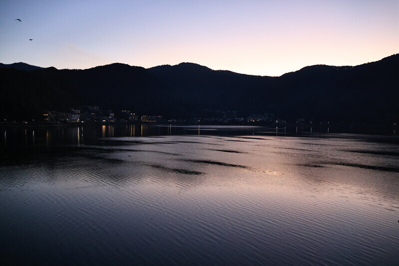 河口湖大橋を渡りつつ眺める湖が徐々に明るくなる空を映して美しいです。