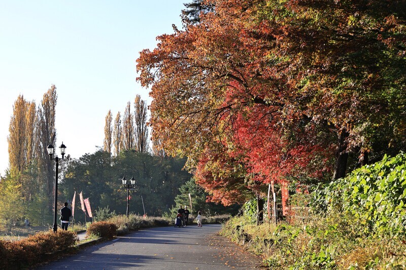 大池公園に到着。駐車場方面から入ります。道沿いの木々が紅葉していて気分が高まります。
