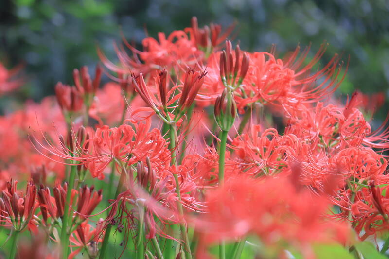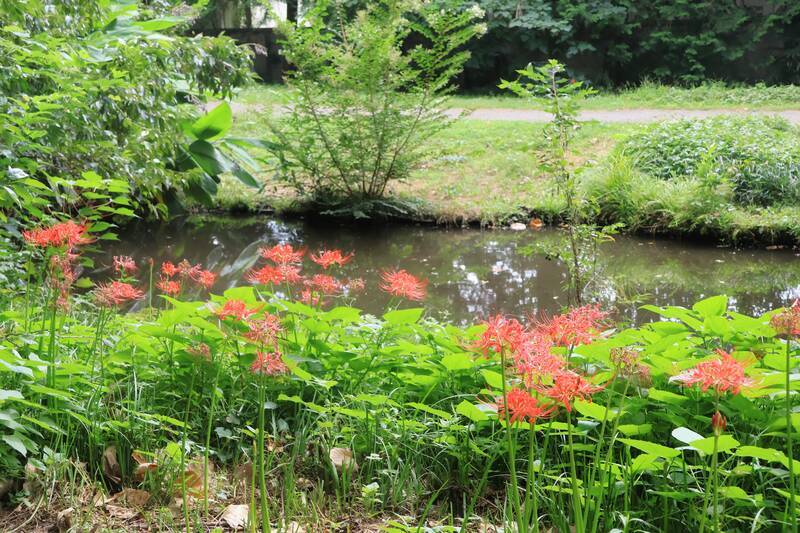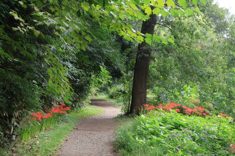 開花時期には燃えるような赤い彼岸花が群生し、緑豊かな園内に鮮やかなアクセントを添えます。花が一斉に立ち上がるように咲く姿はとても印象的で、秋の始まりを感じさせてくれる光景です。
