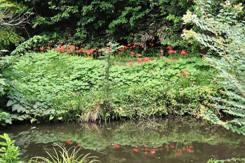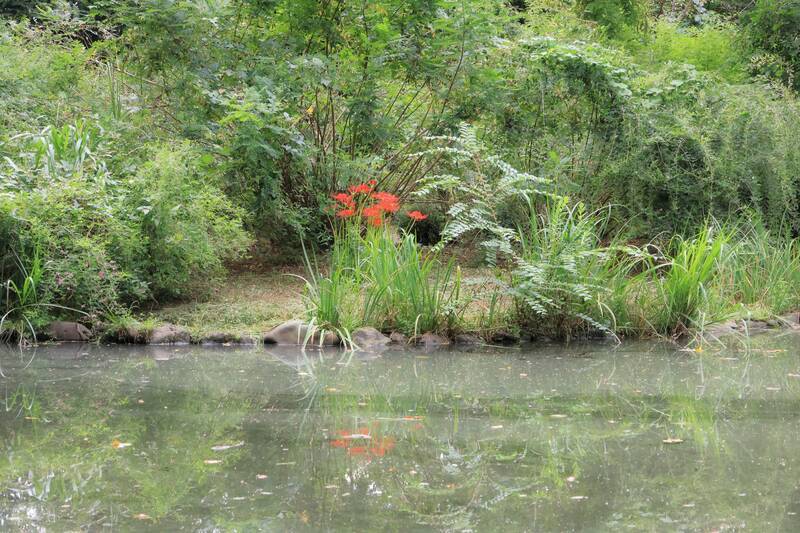 池の反対側から。池に彼岸花が映っています。色々な角度から彼岸花を楽しめました。