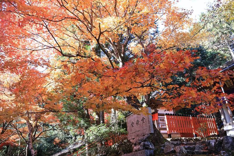 柳谷観音では、紅葉シーズンには自然豊かな広い境内の木々が鮮やかに色づきます。山寺ならではの静寂の中で、鮮やかなモミジやカエデが境内を彩り、訪れる人々に深い秋の情緒を感じさせてくれます。