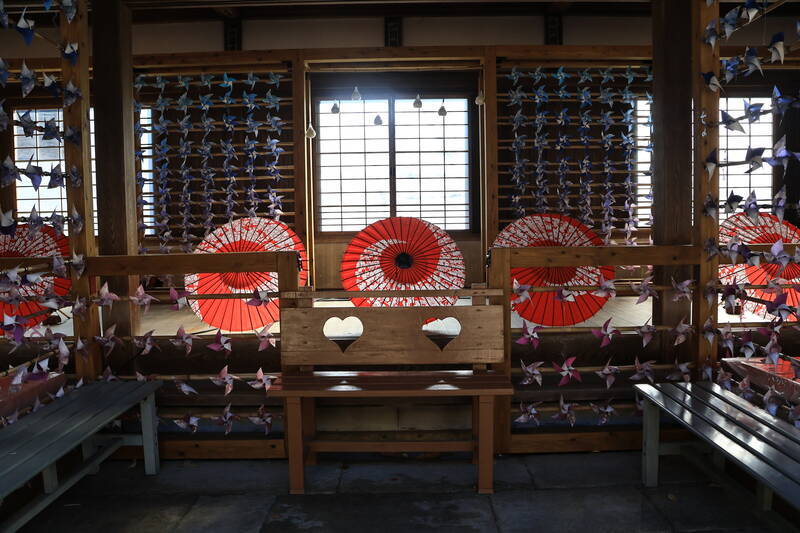 阿弥陀堂も和傘と竹で飾られています。夜にはライトアップが行われるようです。